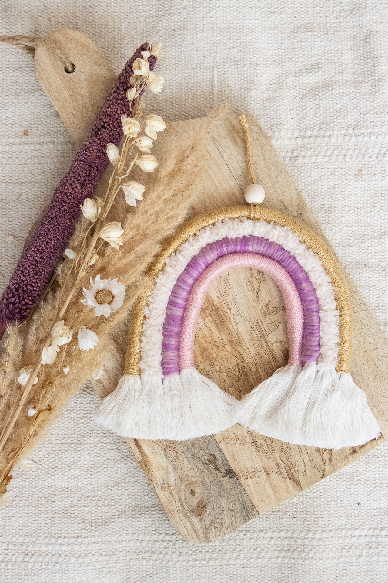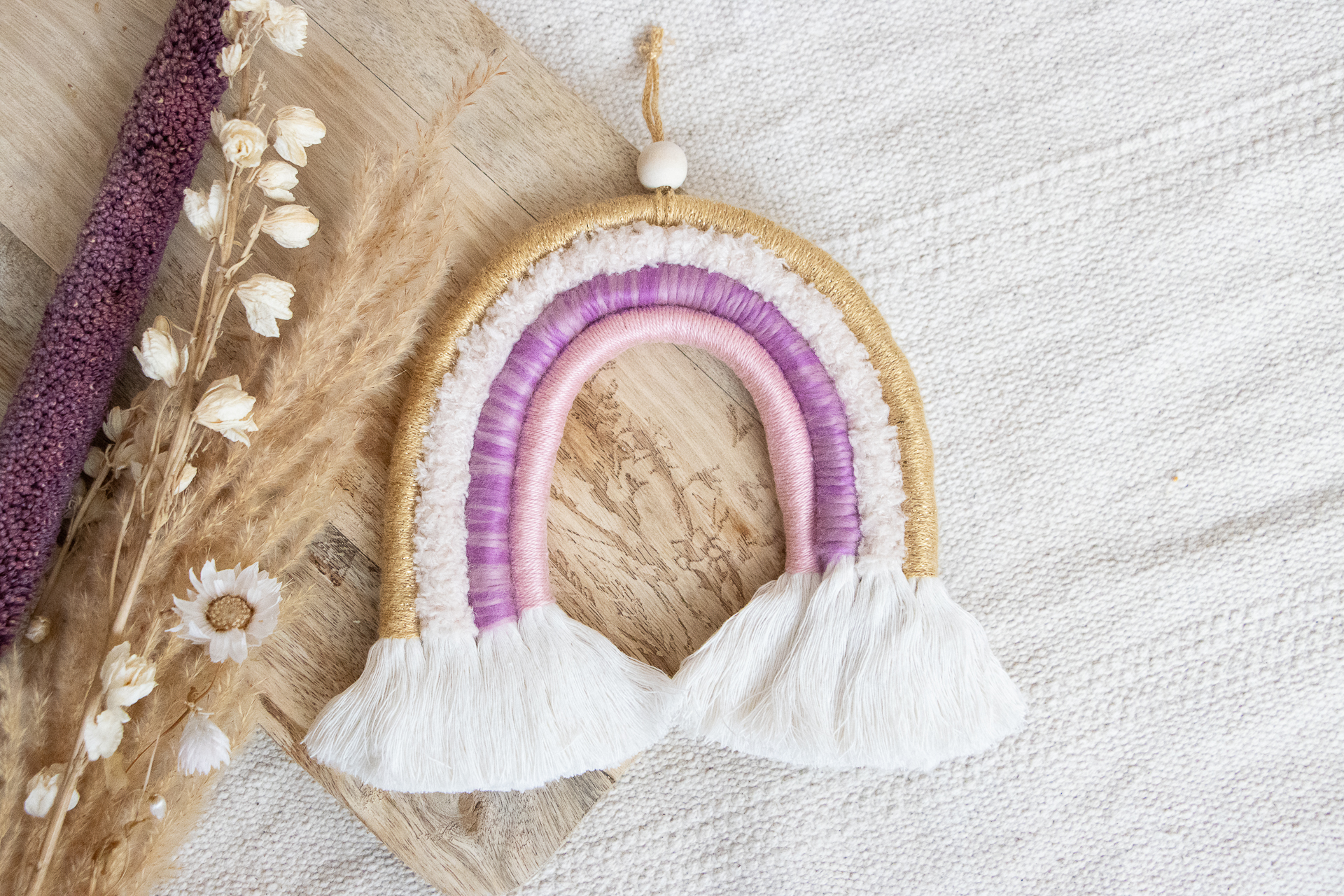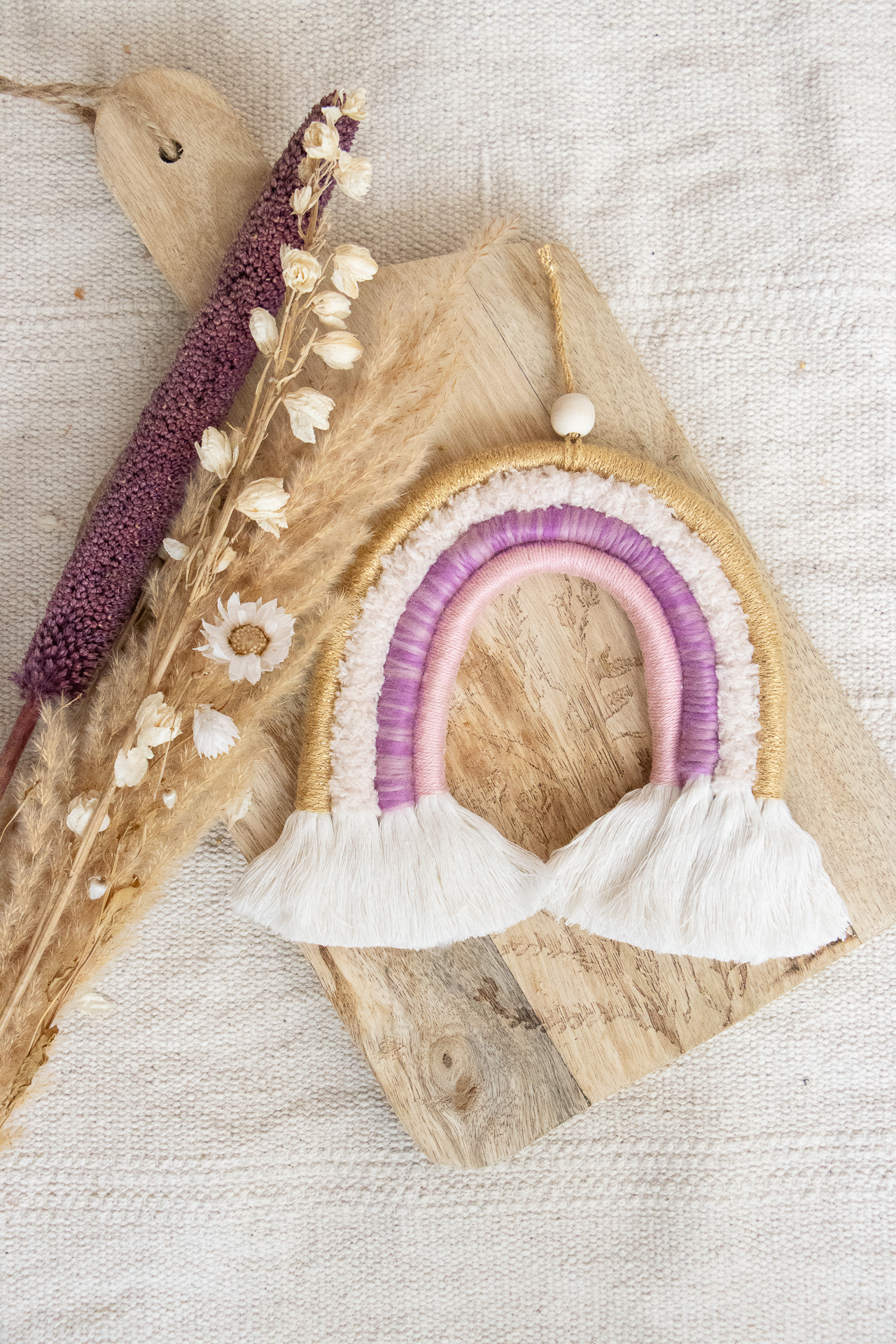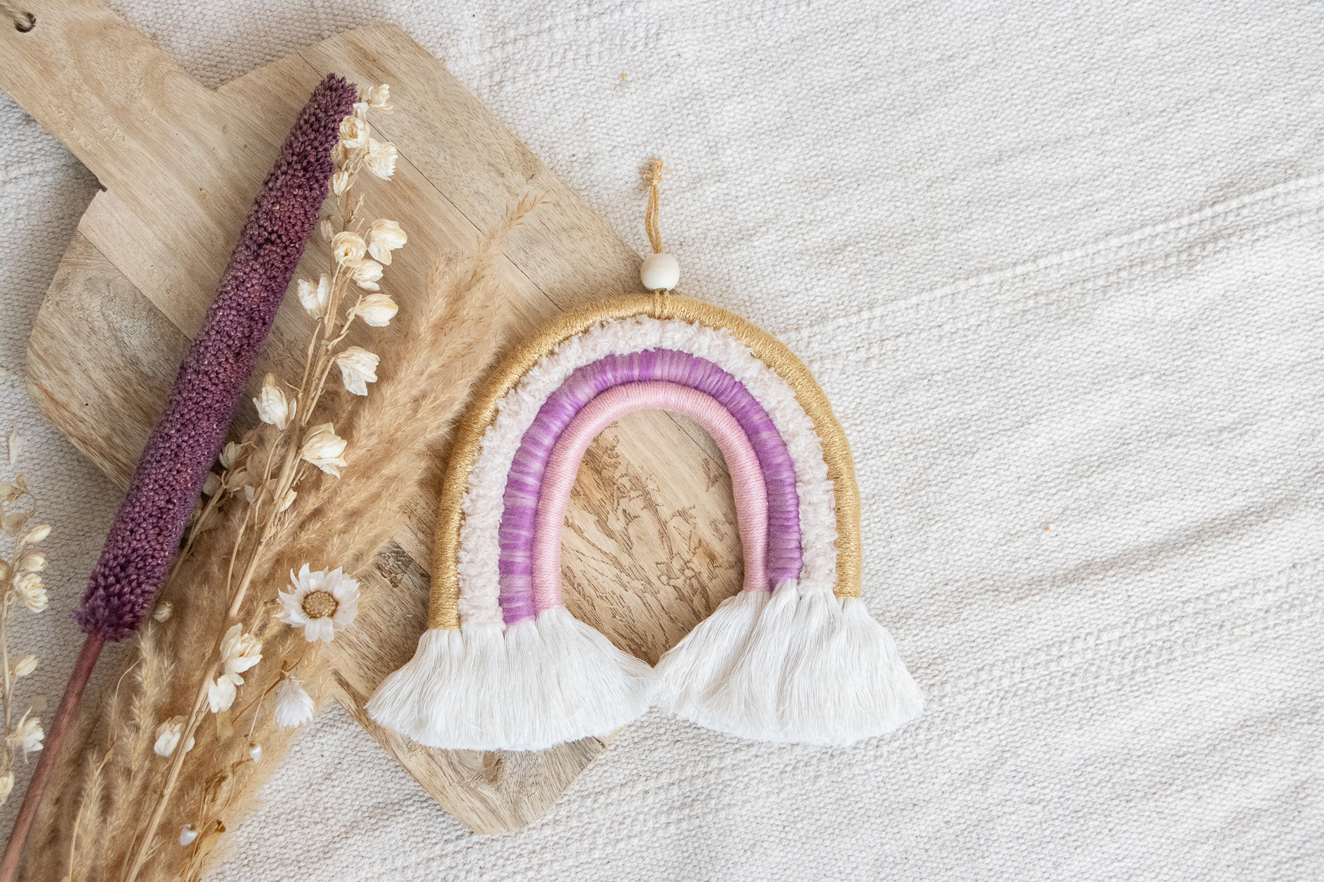 Dit handgemaakte macrame regenboogje in roze tinten is perfect voor een baby- en meisjeskamer. Met een gouden glinstering en fluffy structuur doet ze het goed als kraamcadeau en maakt een kinderkamer extra sprookjesachtig.