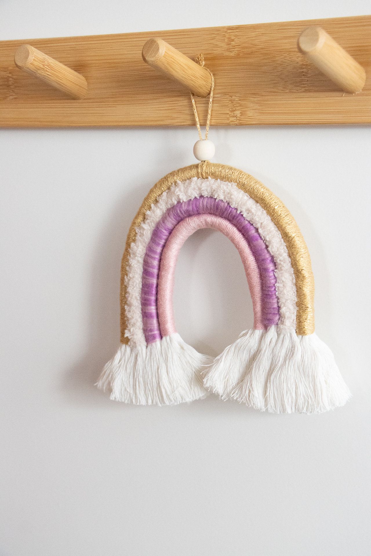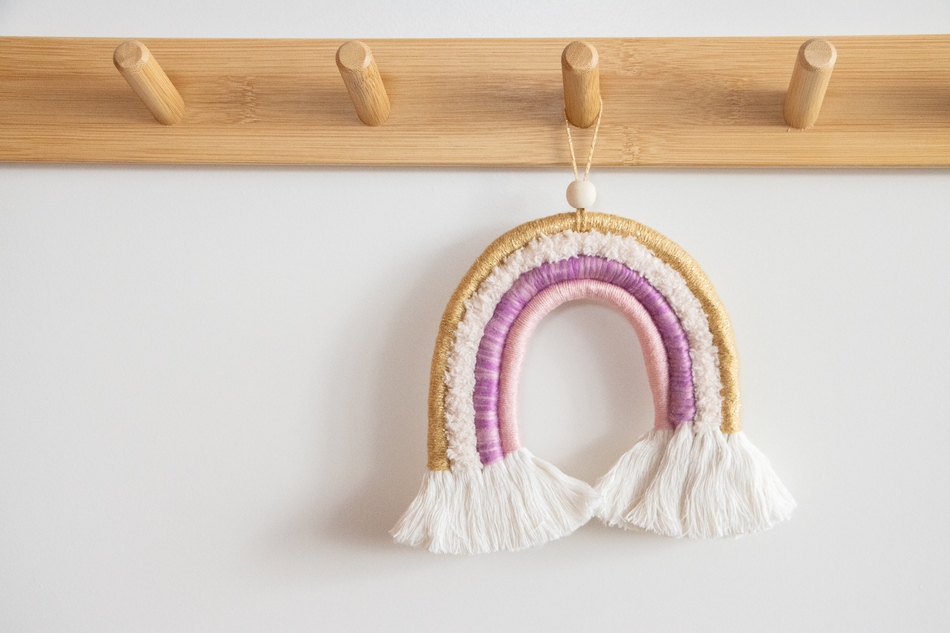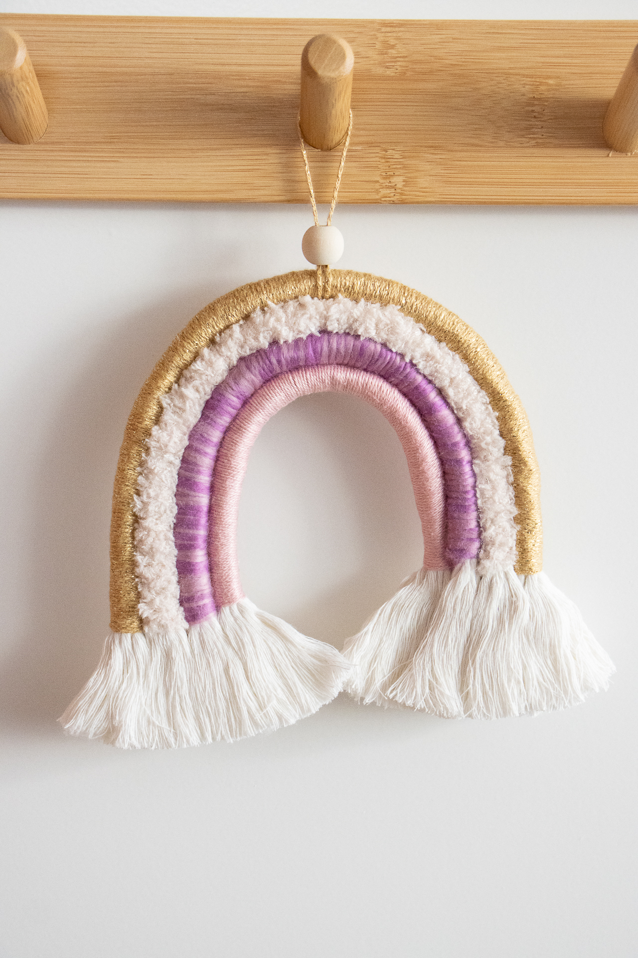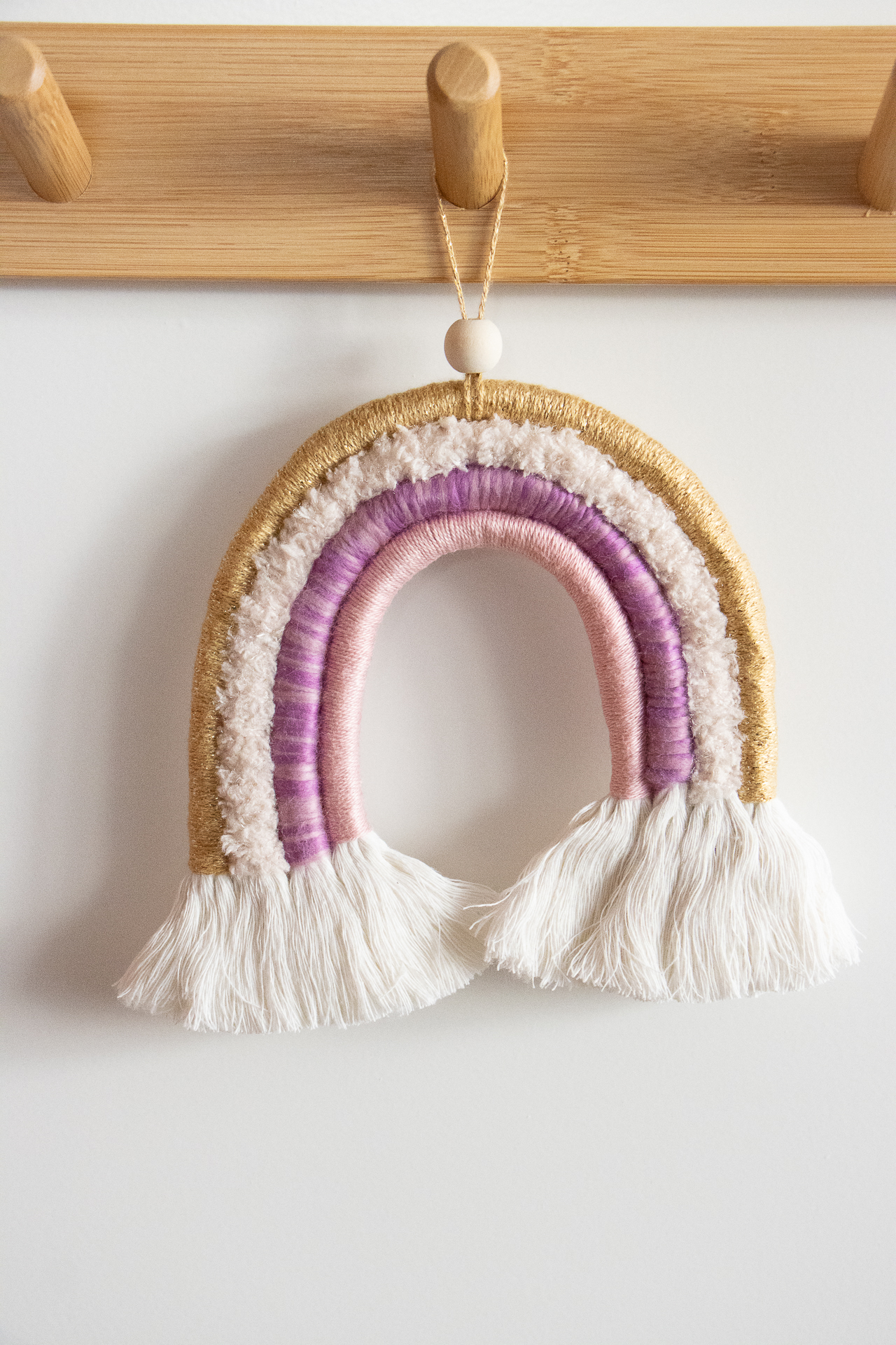 Dit handgemaakte macrame regenboogje in roze tinten is perfect voor een baby- en meisjeskamer. Met een gouden glinstering en fluffy structuur doet ze het goed als kraamcadeau en maakt een kinderkamer extra sprookjesachtig.