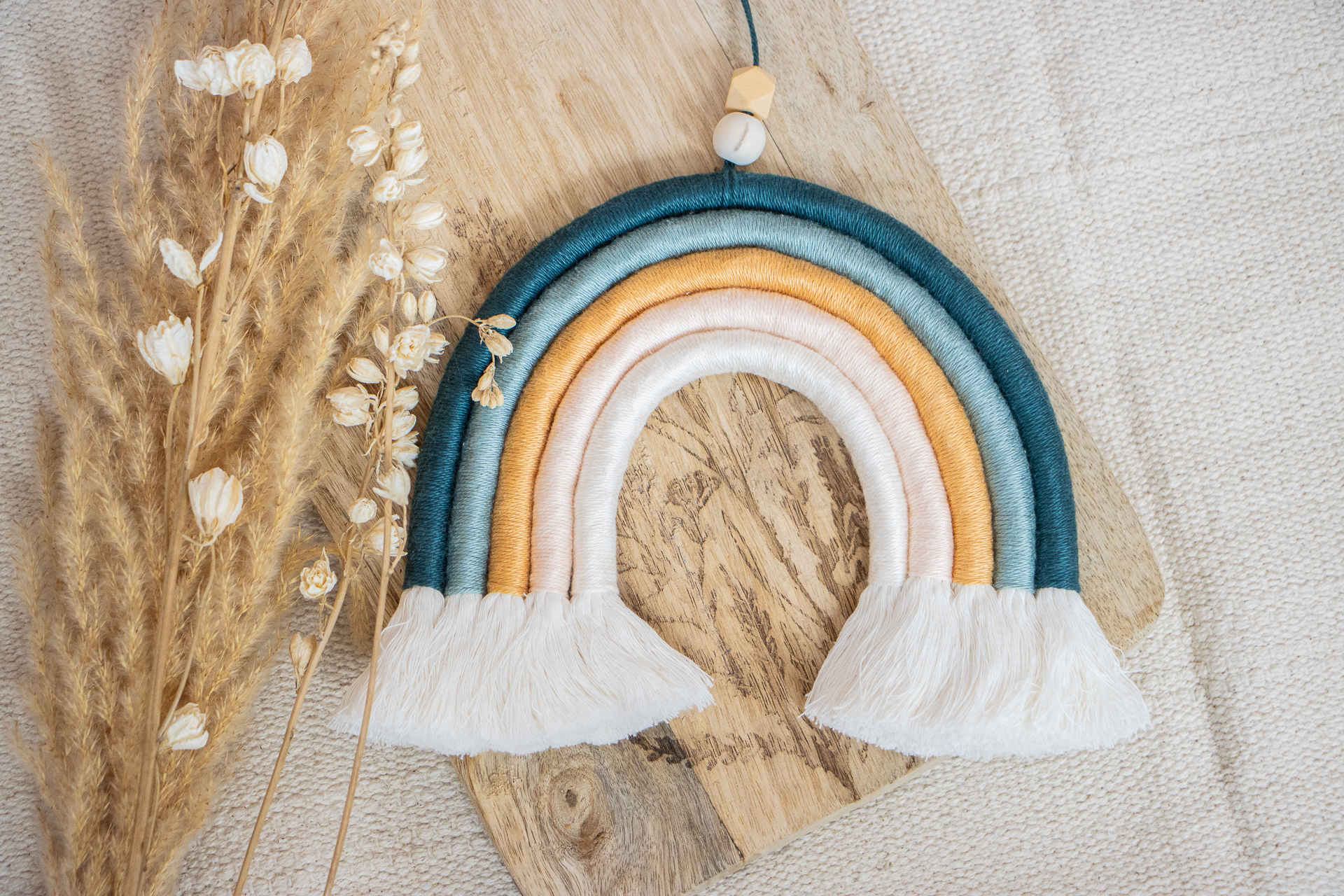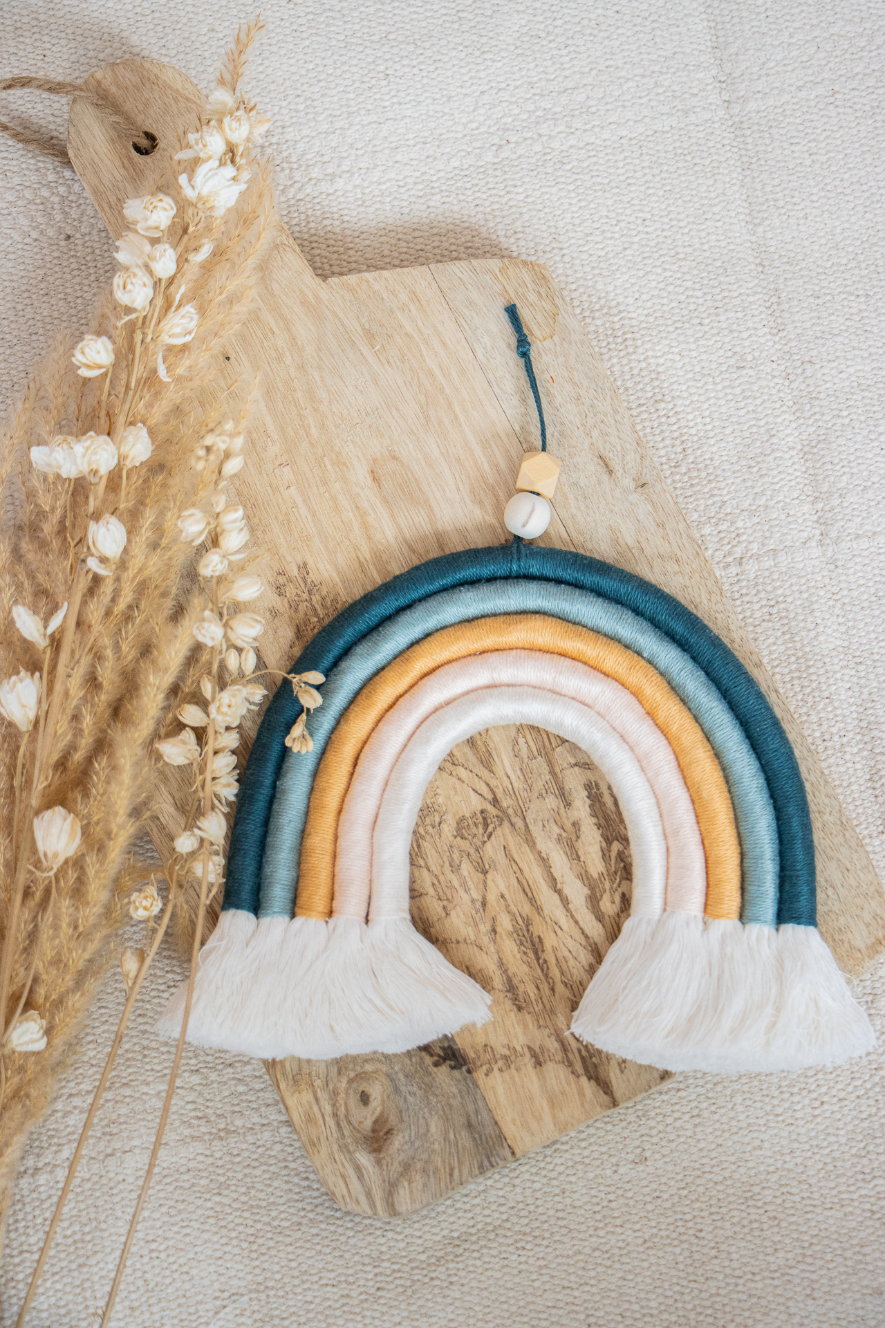 Macrame Regenboogje Ocean Glow is zachte regenboog muurdecoratie in pasteltinten. Je haalt er mooie kleuren van het zeeleven in huis. Een mooi kraamcadeau dat je kunt laten personaliseren met de naam van de pasgeboren baby.