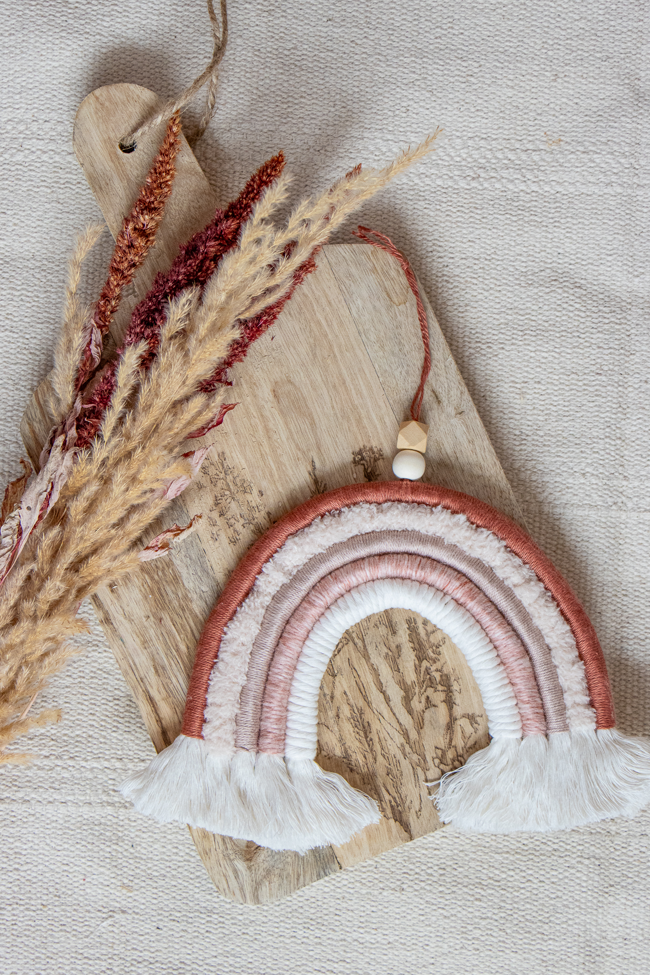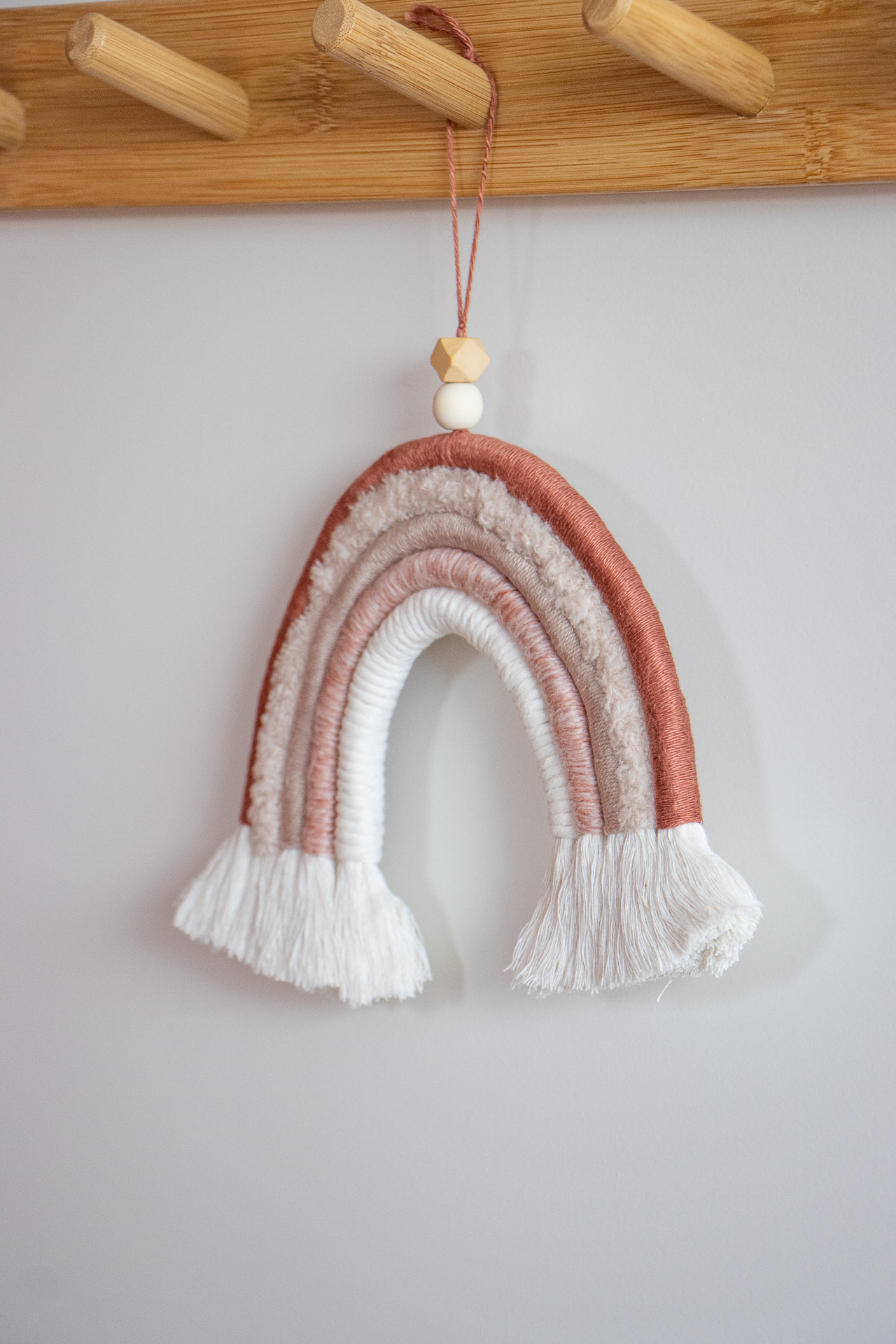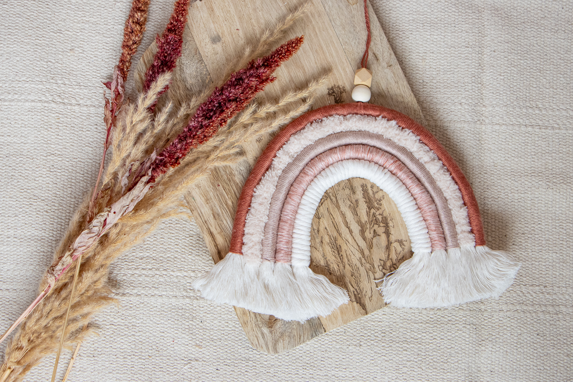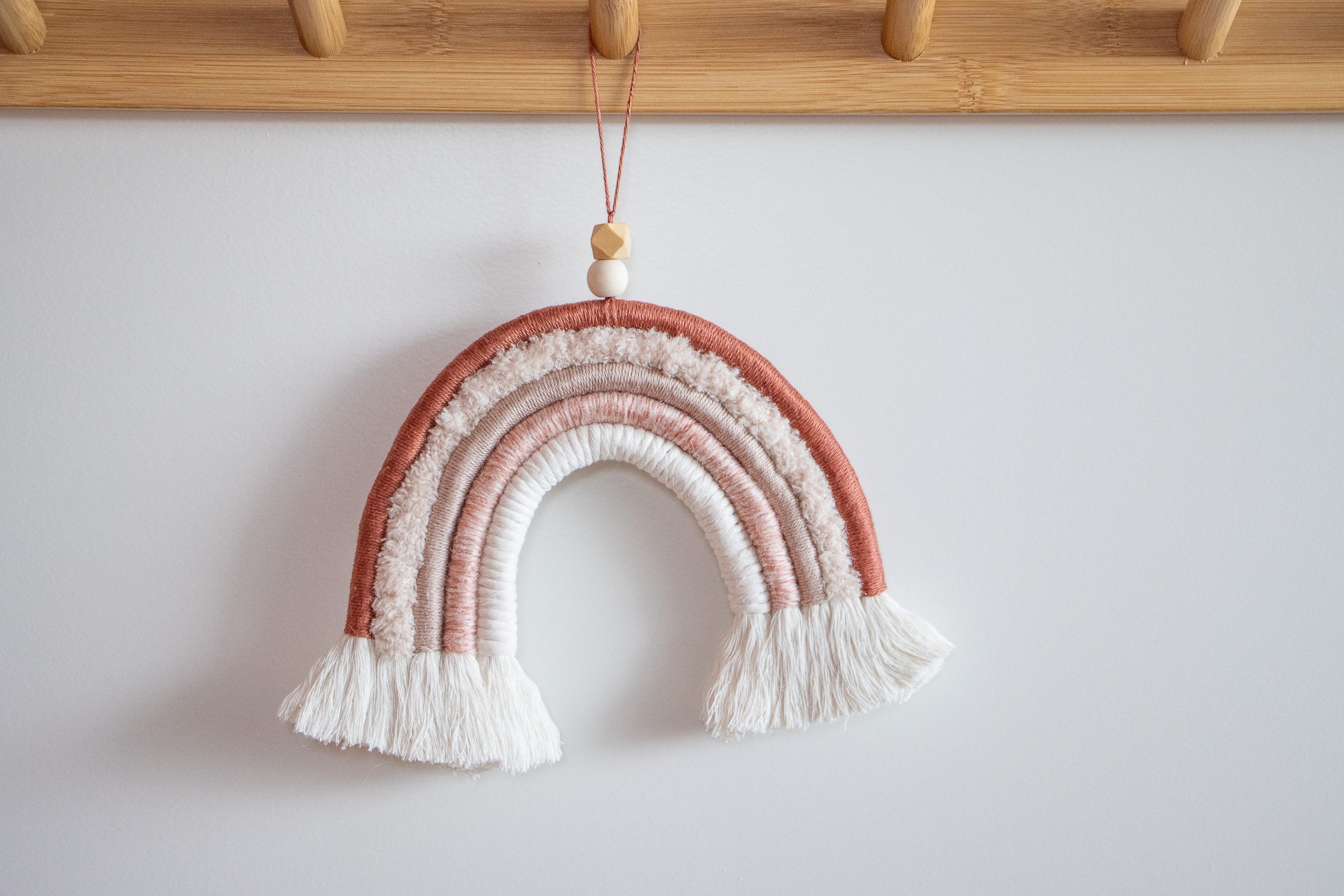 Macramé regenboog in warme aardetinten, handgemaakt van natuurlijke materialen. Perfect als muurdecoratie voor babykamer, kinderkamer of een warm, Scandinavisch interieur.