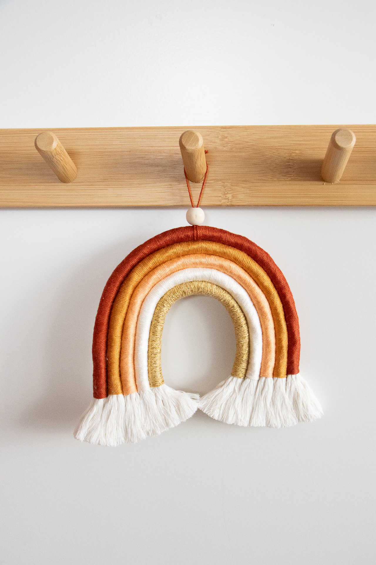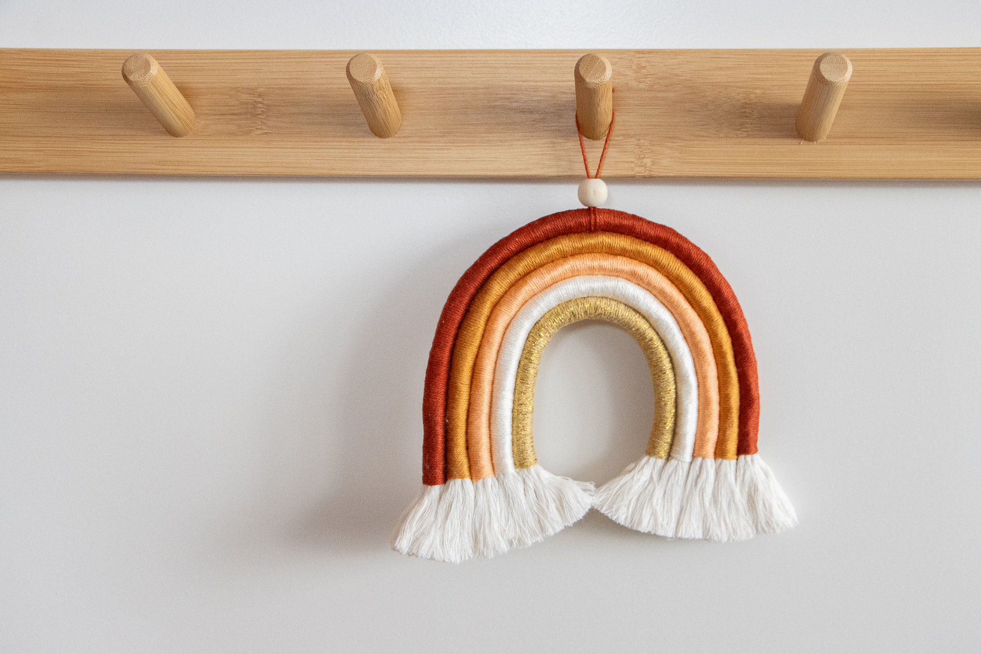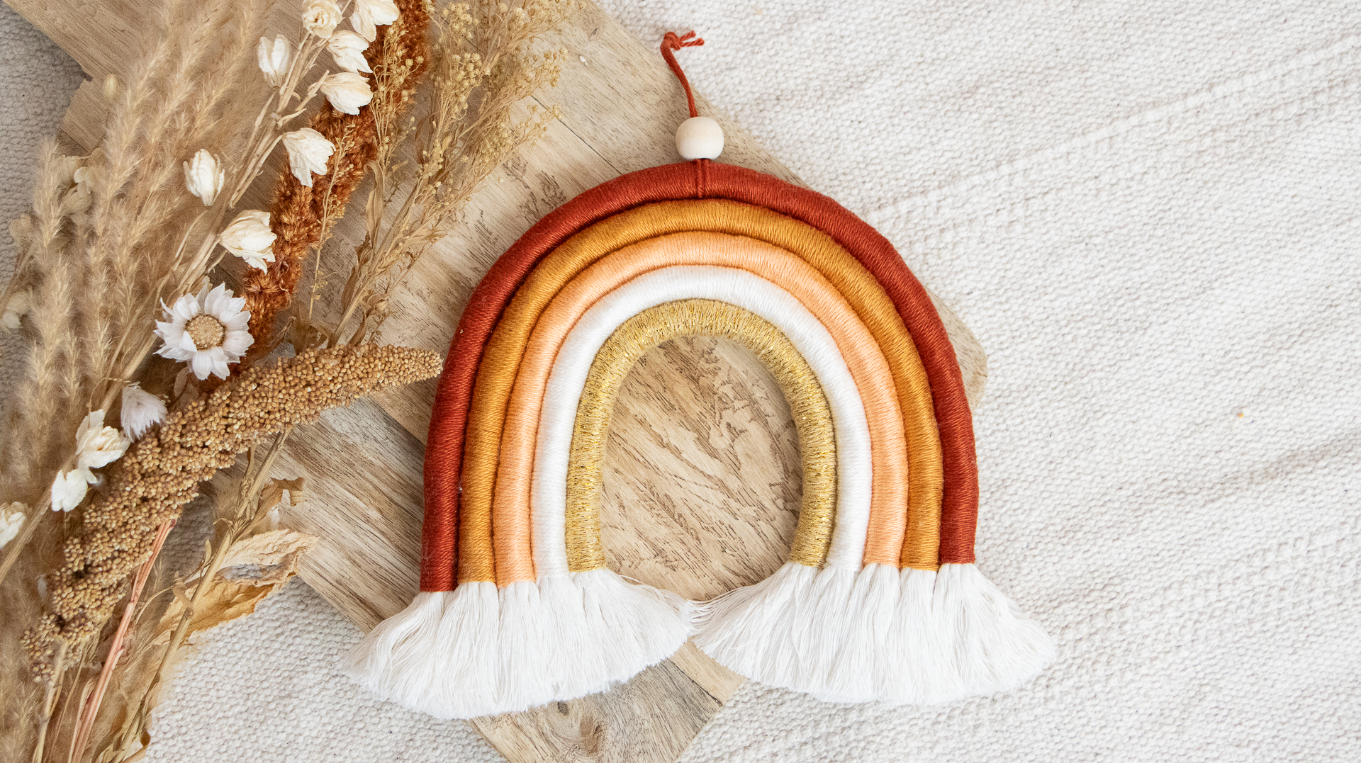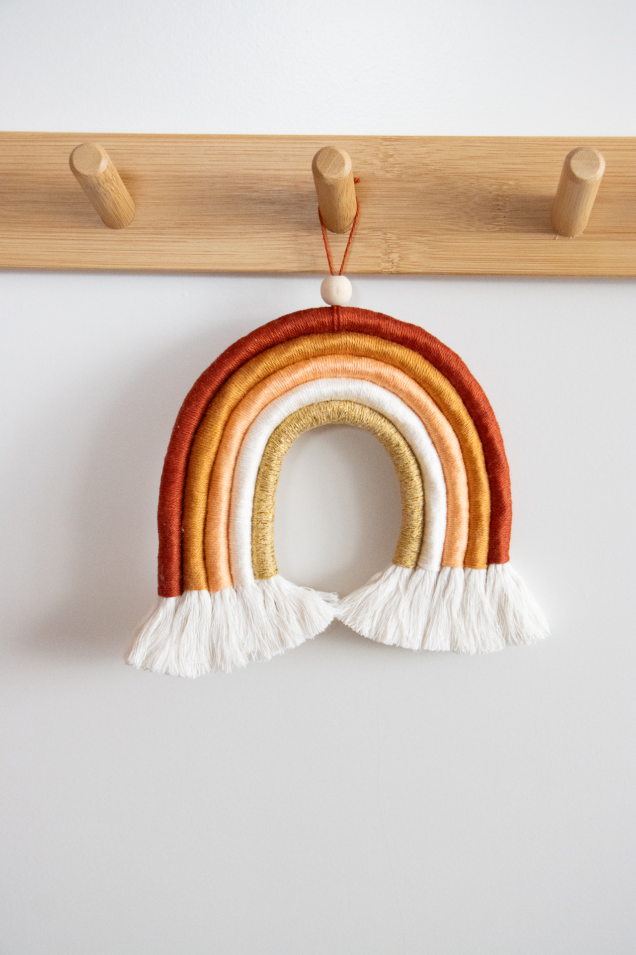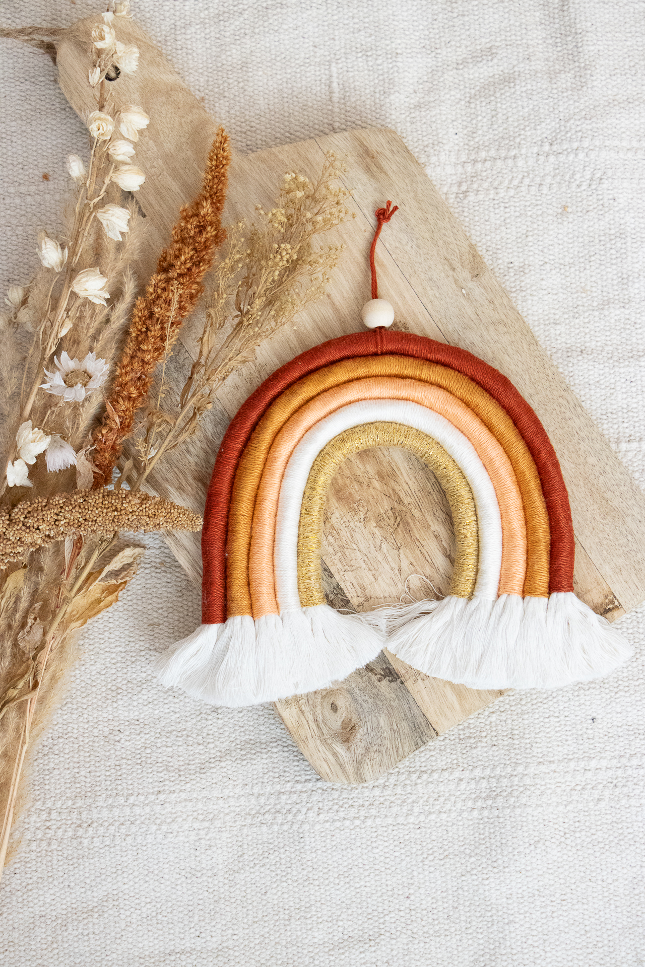 Regenboogje met warme herfstkleuren en een vleugje gouden gloed. Breng de herfstsfeer in huis met macramé regenboogje Autumn Sunset. Sfeervolle, handgemaakte decoratie voor de babykamer of een boho interieur.